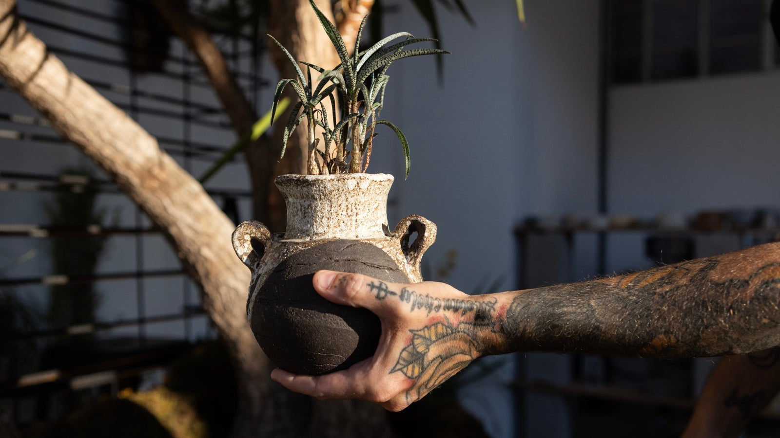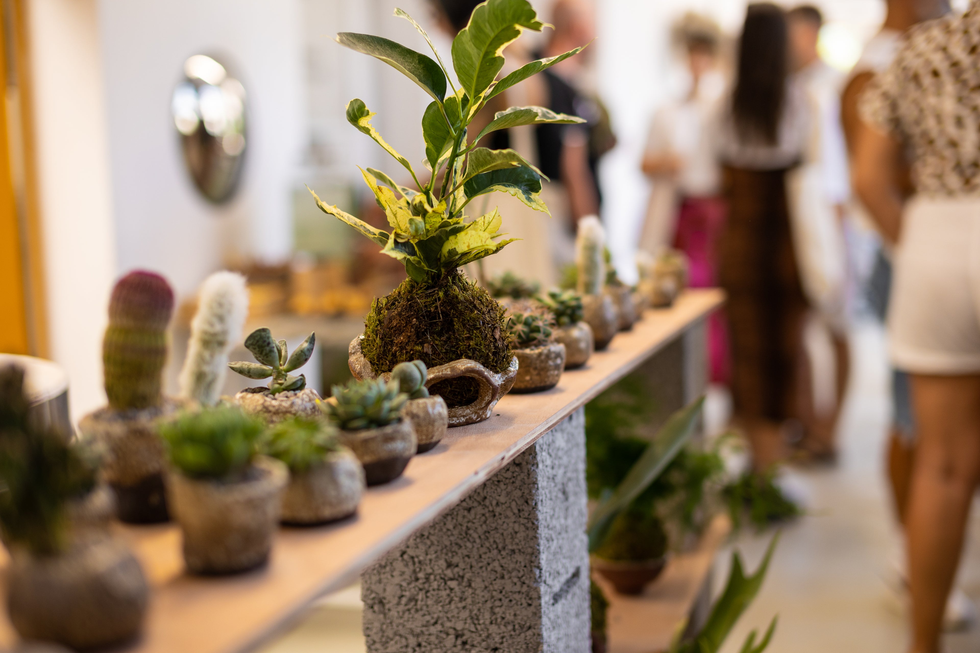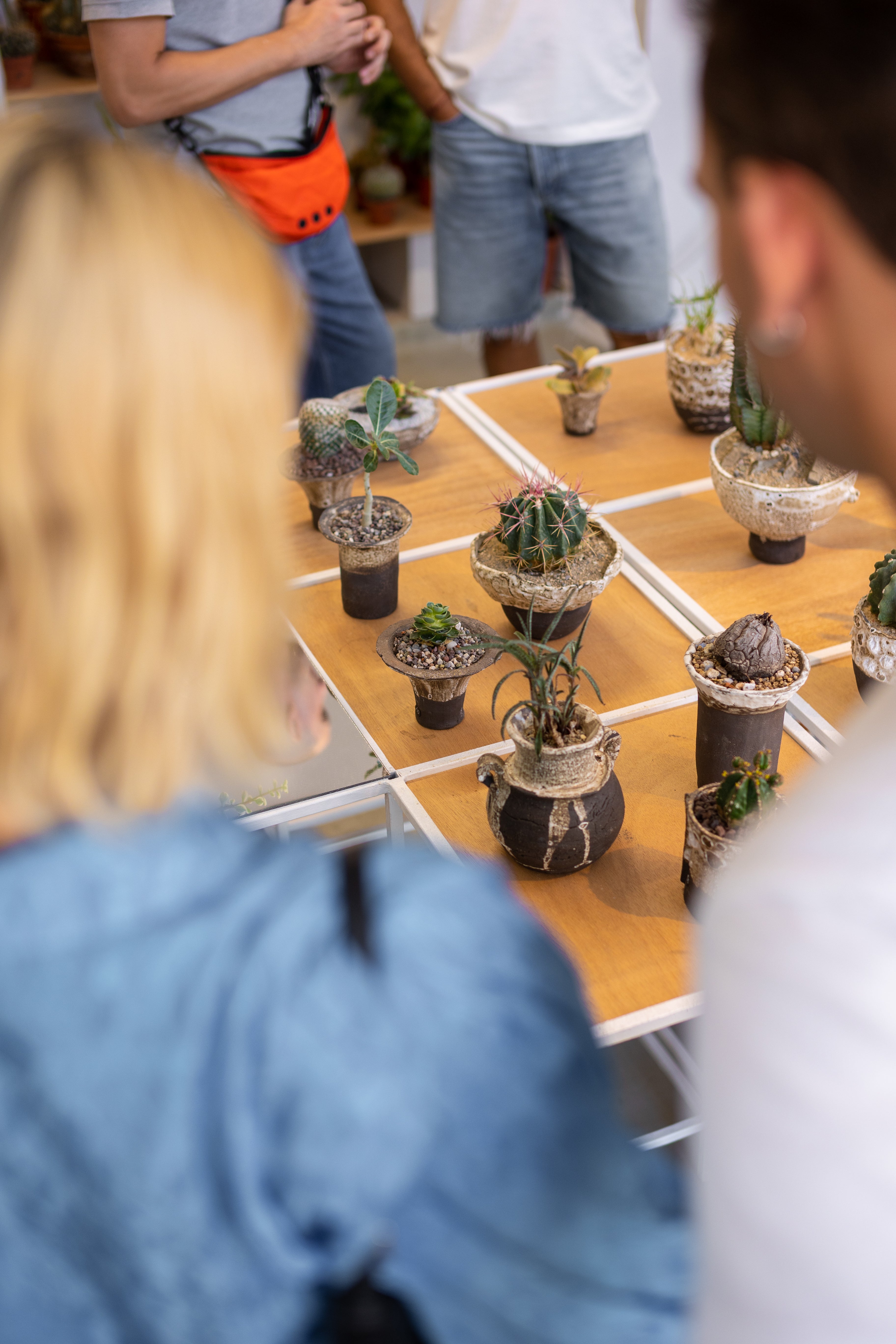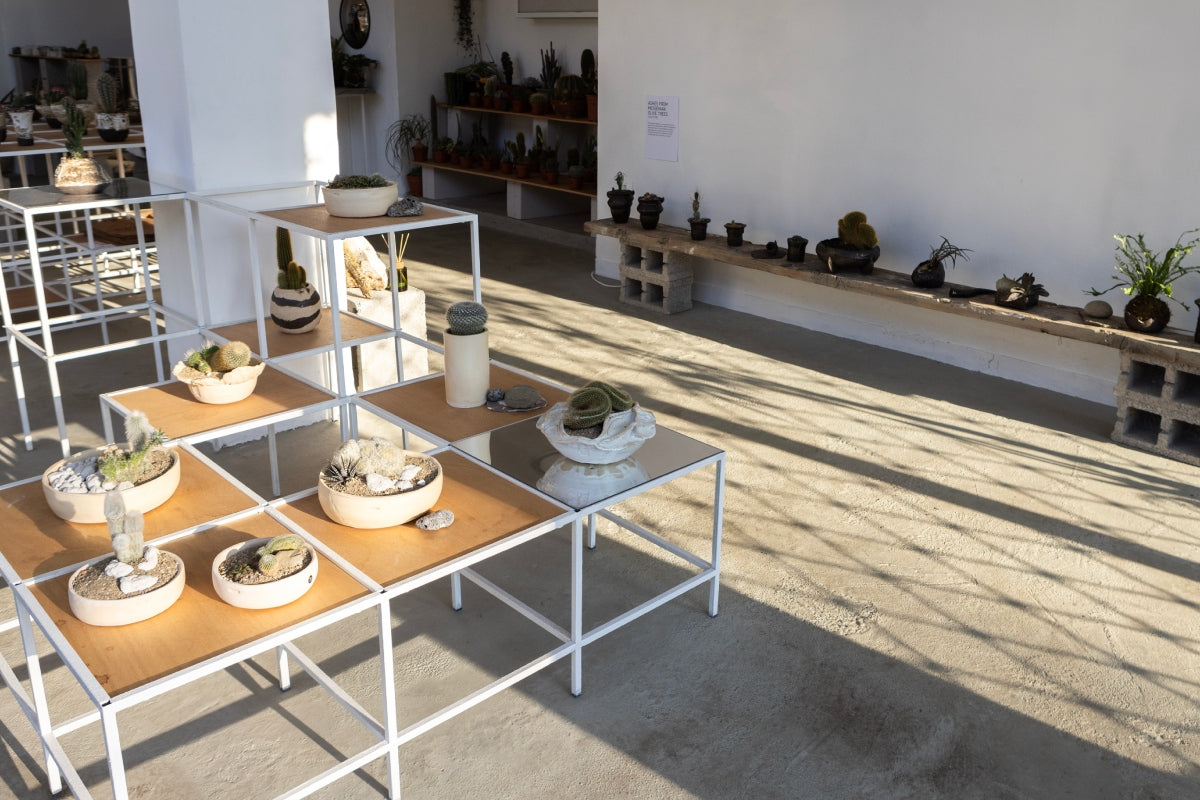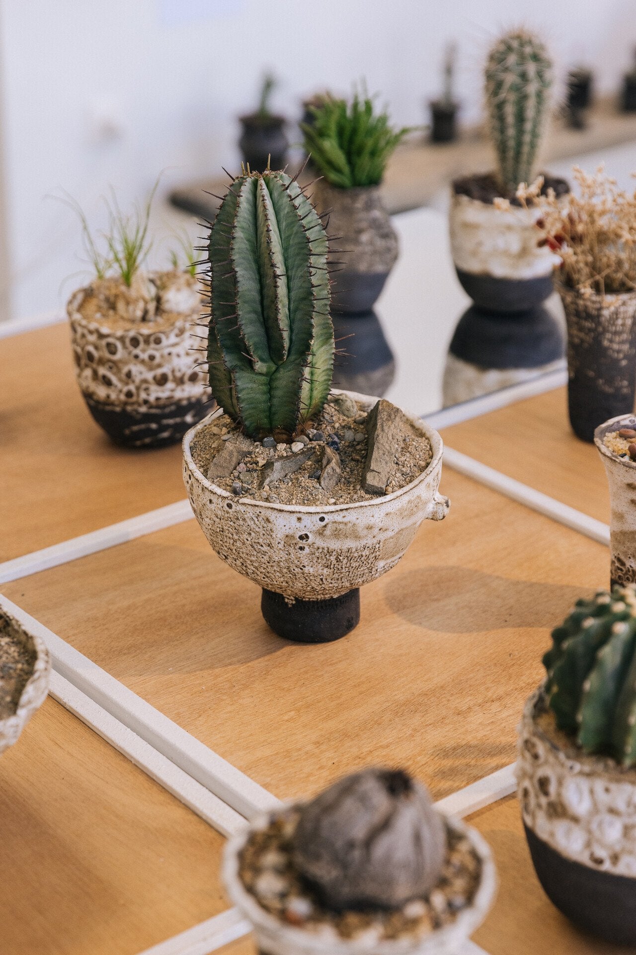 Κάθε φυτό βρίσκει το σπίτι του σε ένα χειροποίητο κεραμικό κομμάτι, σχηματίζοντας μια γλυπτική σύνθεση.