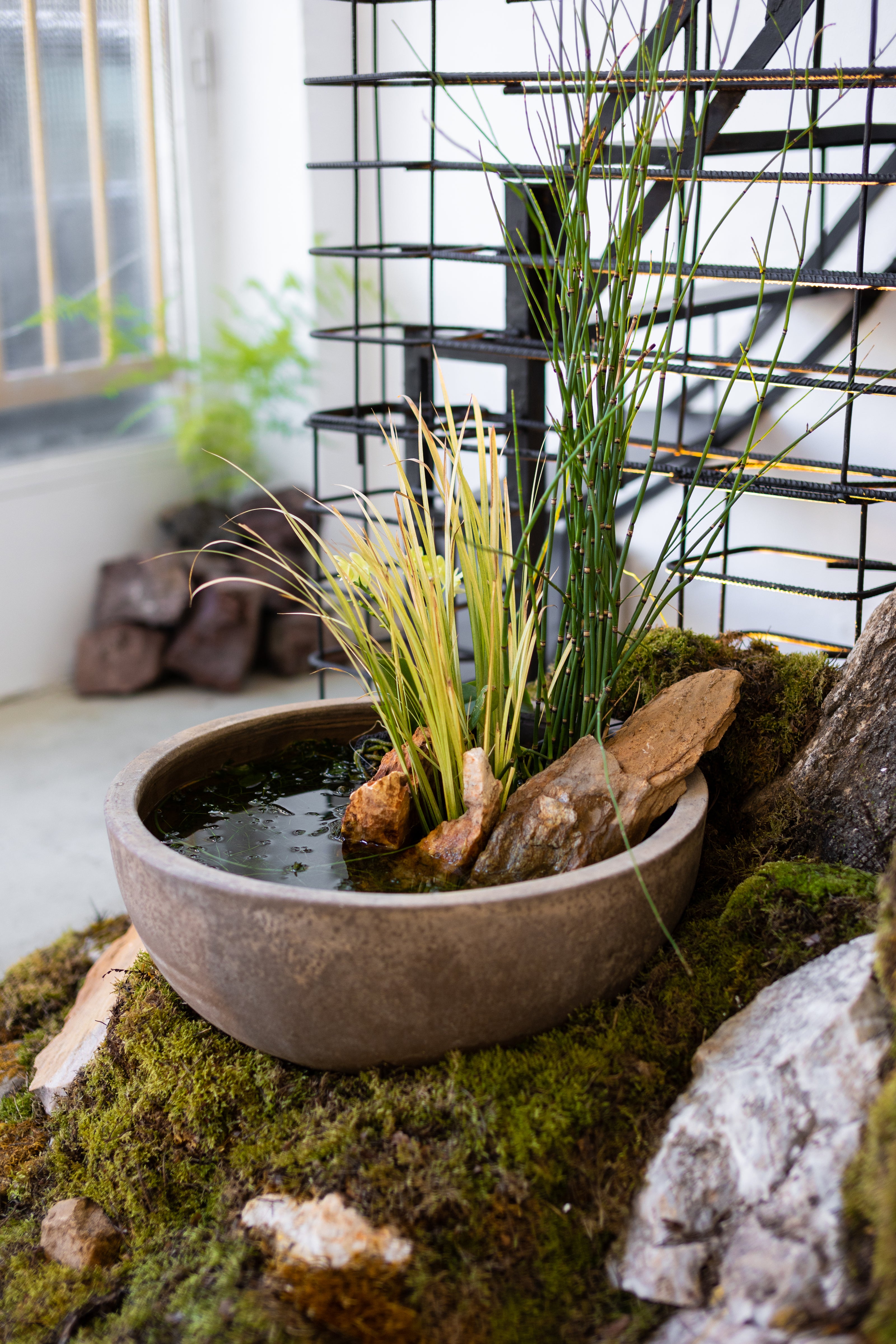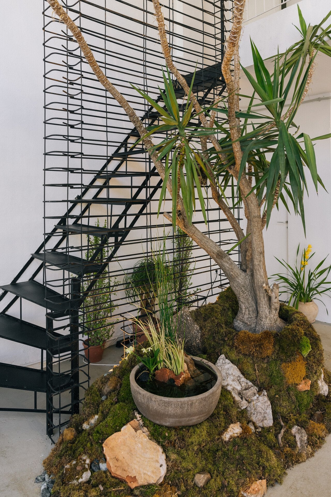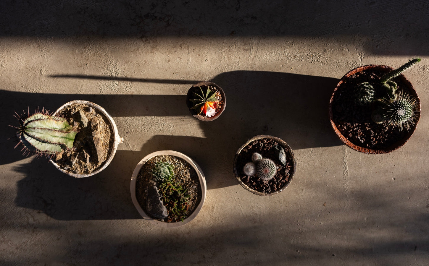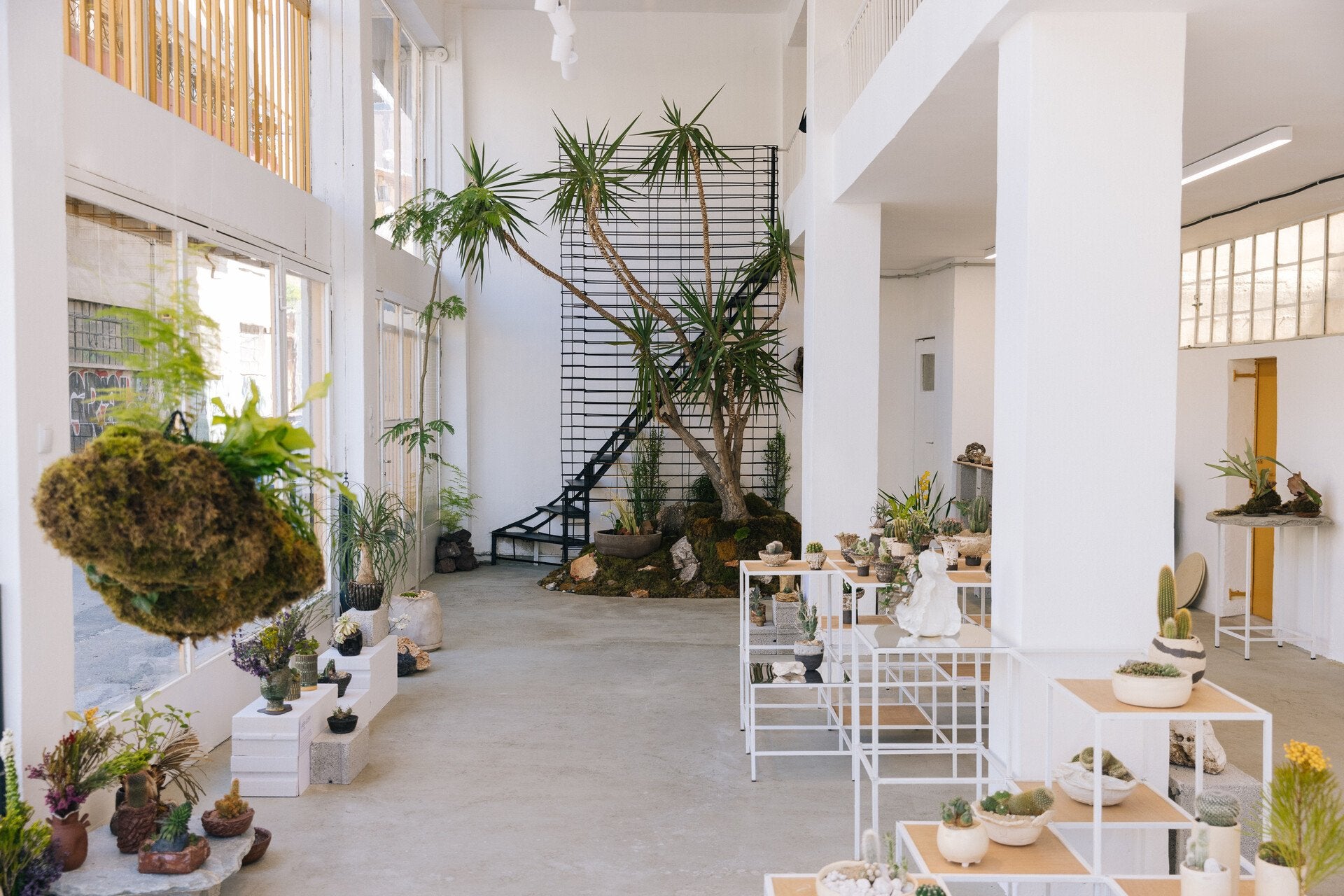 Κάθε φυτό βρίσκει το σπίτι του σε ένα χειροποίητο κεραμικό κομμάτι, σχηματίζοντας μια γλυπτική σύνθεση.