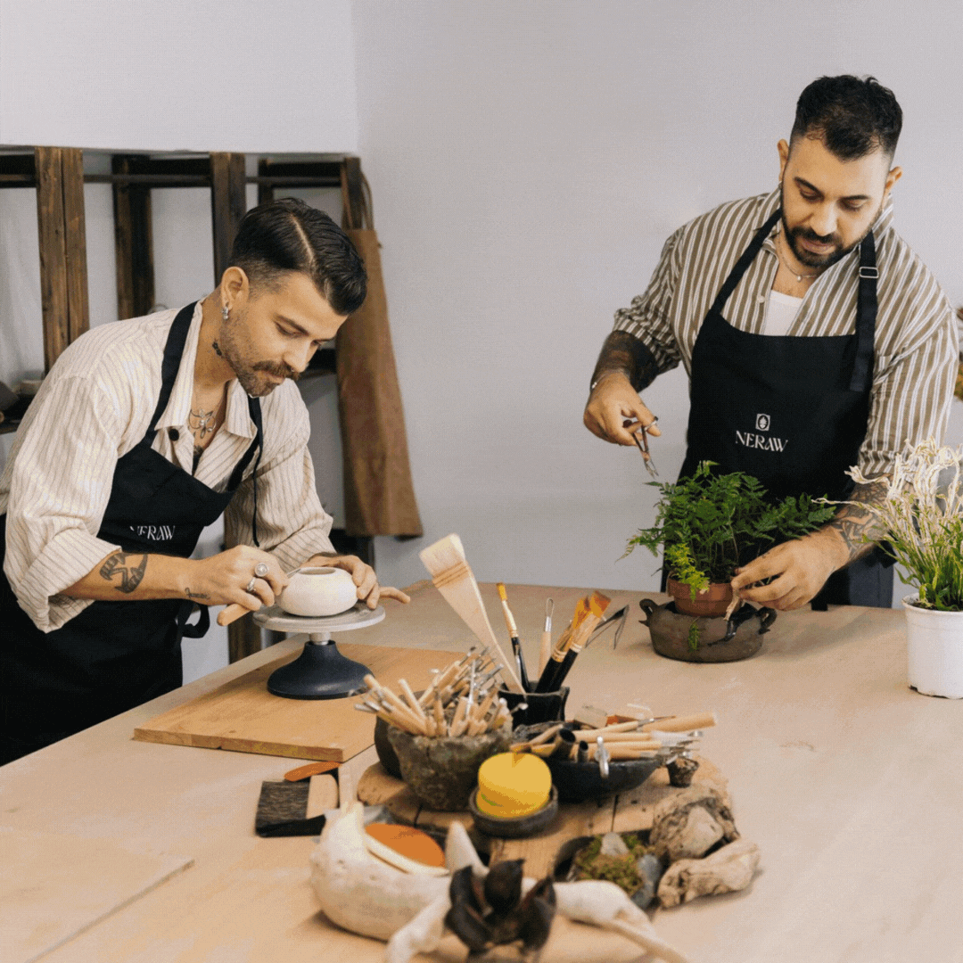 Πίσω από το Neraw είμαστε εμείς: ο Κωνσταντίνος, plant designer, και ο Γιώργος, ceramic designer. Μαζί σχεδιάζουμε έργα που ενώνουν τη ζωή των φυτών με τη δύναμη του πηλού, ως ένας διάλογος μεταξύ μορφής και φύσης.