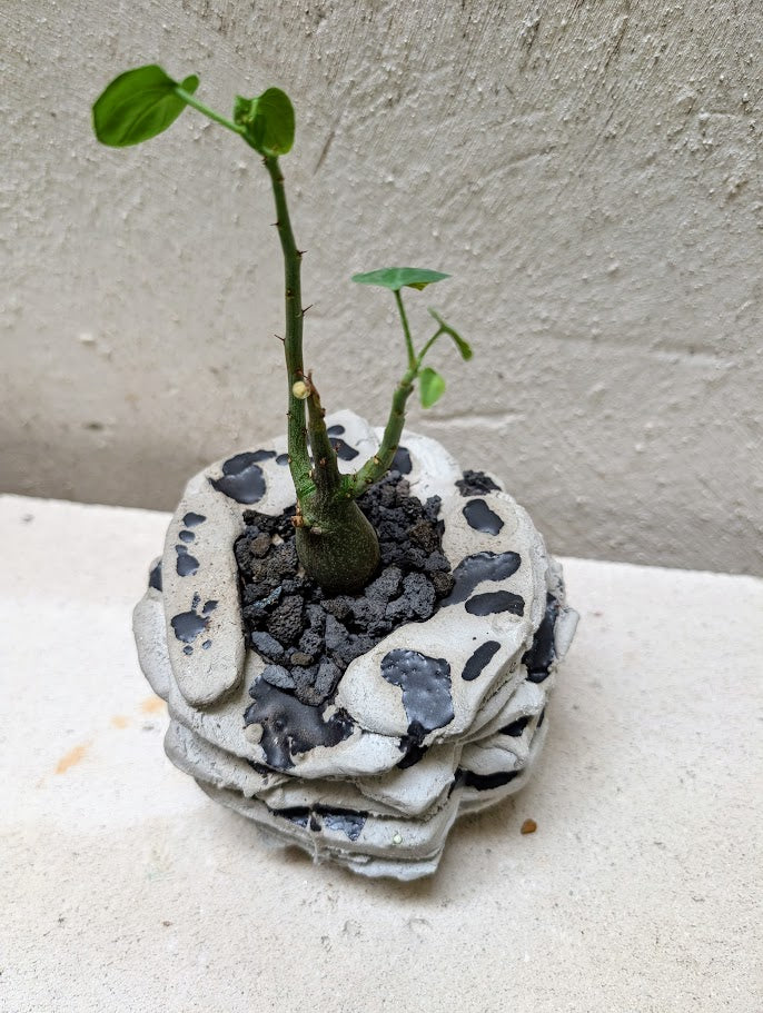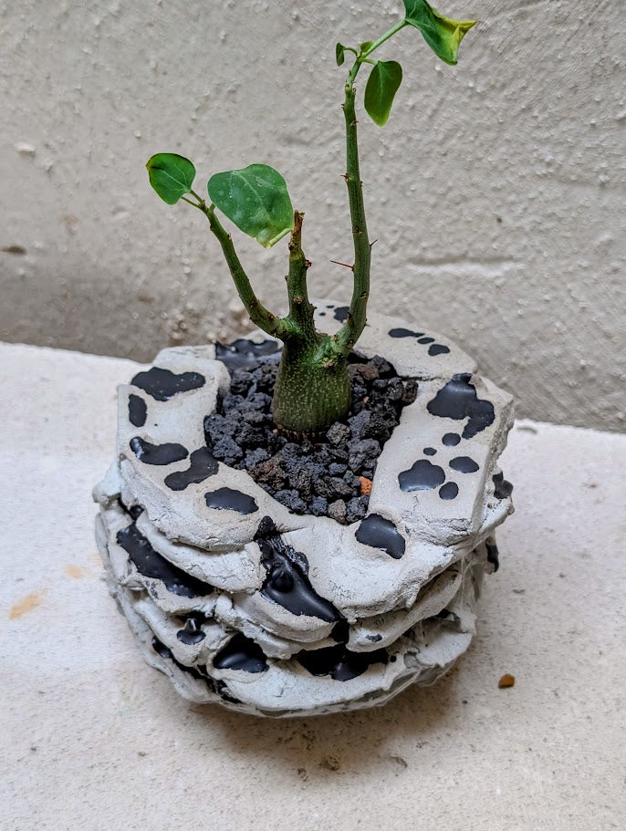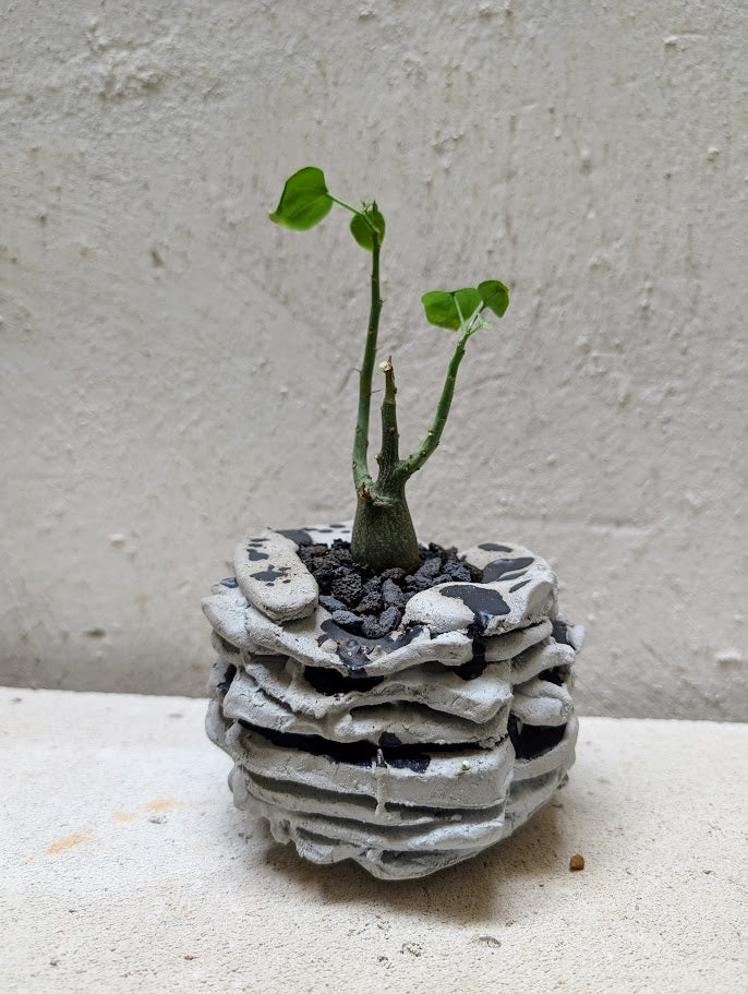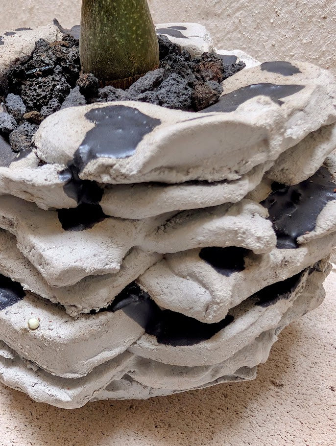 Φυτευμένο σε χειροποίητο κεραμικό δοχείο Neraw με στρωματοποιημένη, βραχώδη μορφή που θυμίζει συμπιεσμένα γεωλογικά στρώματα.