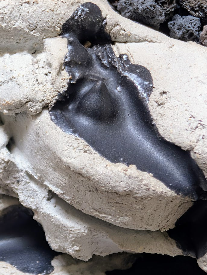 Το απαλό, με ορυκτά χρώματα σώμα διακόπτεται από σκούρες, ηφαιστειακές πινελιές που φαίνεται να διαπερνούν την επιφάνεια, δημιουργώντας μια ακατέργαστη, σχεδόν τεκτονική υφή.