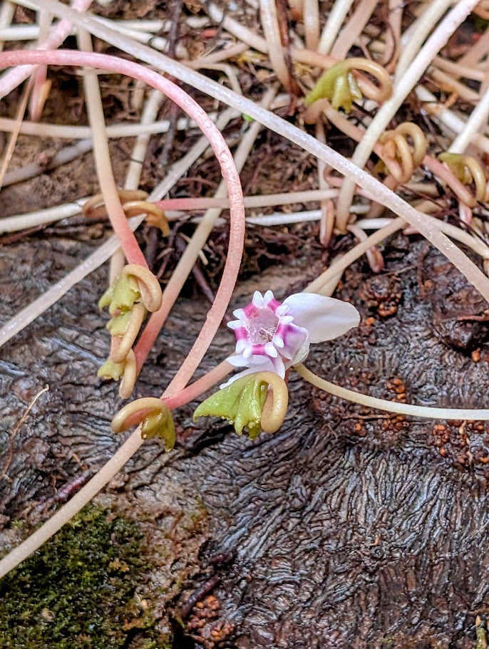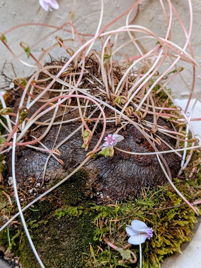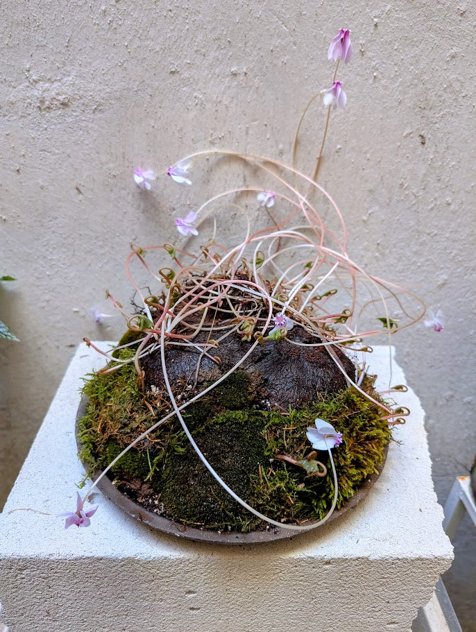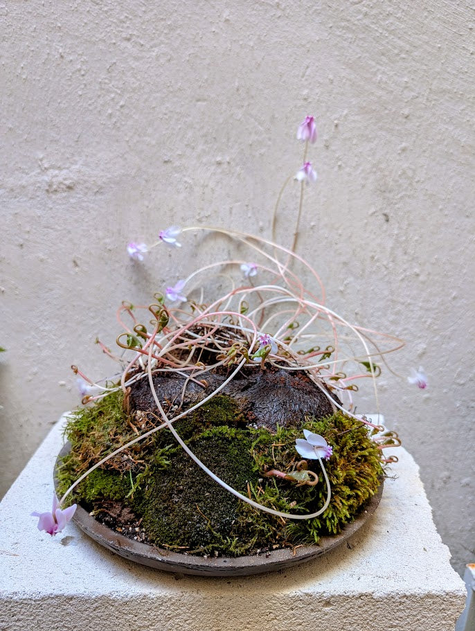 Το Cyclamen hederifolium είναι ένα ανθεκτικό, κονδυλώδες πολυετές φυτό που προέρχεται από την περιοχή της Μεσογείου, το οποίο θαυμάζεται για τον γλυπτό βολβό του και τα ντελικάτα άνθη του που αναδύονται σε αποχρώσεις από απαλό ροζ έως λεβάντα πριν εμφανιστούν τα φύλλα. Το συγκεκριμένο διαθέτει ένα ώριμο, εκτεθειμένο βλαστό (8-10 ετών) που τονίζεται από βρύα που μοιάζει με μικροσκοπικό τοπίο δάσους. Κατά τη διάρκεια του φθινοπώρου και του χειμώνα, αναδύονται φύλλα σε σχήμα καρδιάς, ακολουθούμενα από μια περίοδο αδρανούς ανάπαυσης το καλοκαίρι, όταν ο βολβός αποθηκεύει ενέργεια για την ανάπτυξη της επόμενης σεζόν.