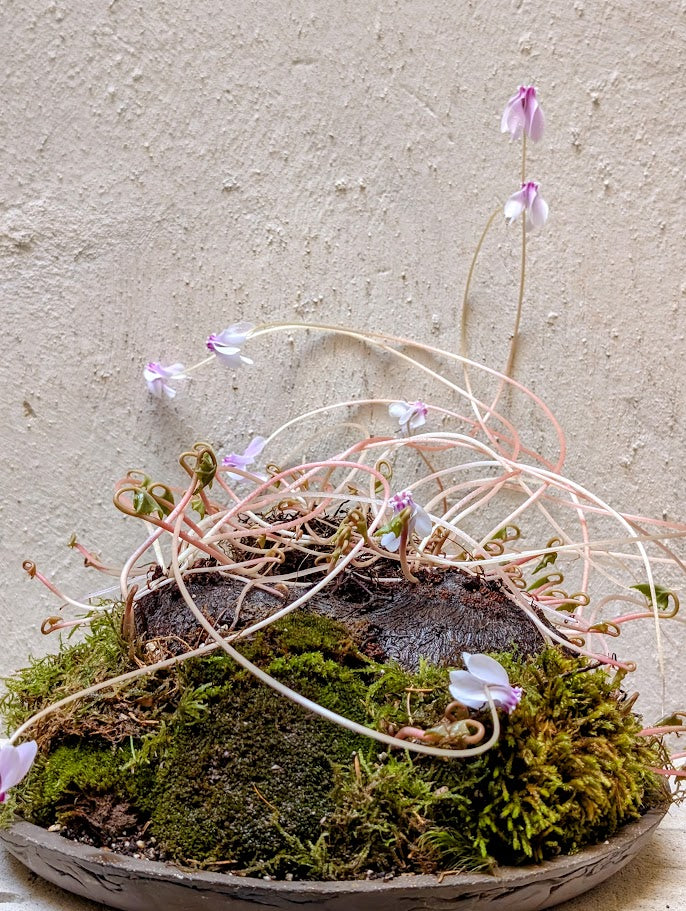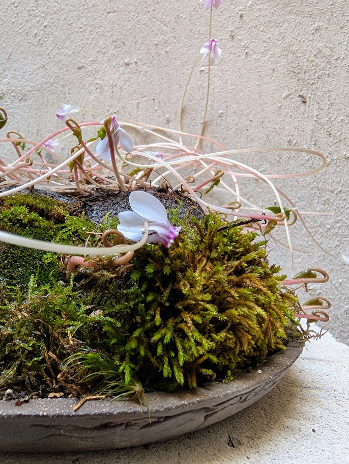 Ένα ρηχό πιάτο εμπνευσμένο από την ikebana, χειροποίητο από σκούρο πηλό με απαλές, σκαλιστές άκρες και ένα οργανικό, ανομοιόμορφο προφίλ. Η επιφάνεια φέρει διακριτικά σημάδια υφής και φυσικές παραλλαγές στον τόνο, που θυμίζουν πέτρινες πλάκες που χρησιμοποιούνται στην παραδοσιακή ιαπωνική ανθοσυνθεση. Σχεδιασμένο ως χαμηλό δοχείο τοπίου, περιέχει ένα ζωντανό χαλί από βρύα που υψώνεται σαν μια μικρή πλαγιά, δημιουργώντας ένα ήσυχο σκηνικό για να αναδυθούν τα ντελικάτα κυκλάμινα.