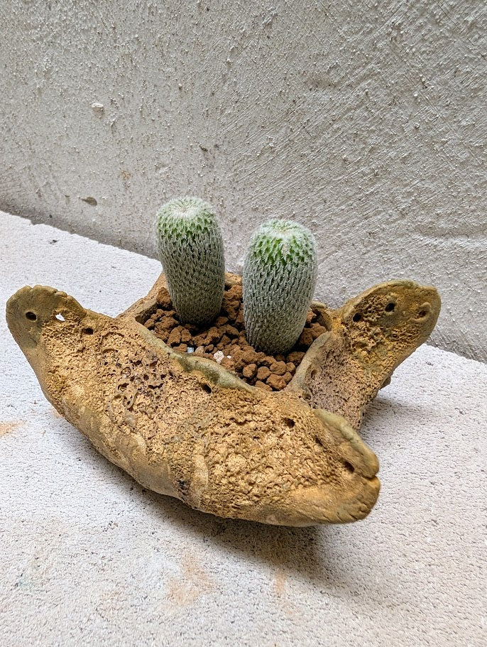 The low, open form frames the cactus without overpowering it, letting the fine white texture become the focal point.