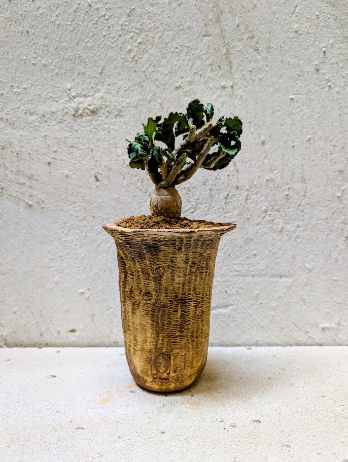 Φυτευμένο σε ψηλό, χειροποίητο κεραμικό δοχείο Neraw με κάθετα σκαλιστή υφή που θυμίζει διαβρωμένο φλοιό ή φθαρμένη πέτρα.