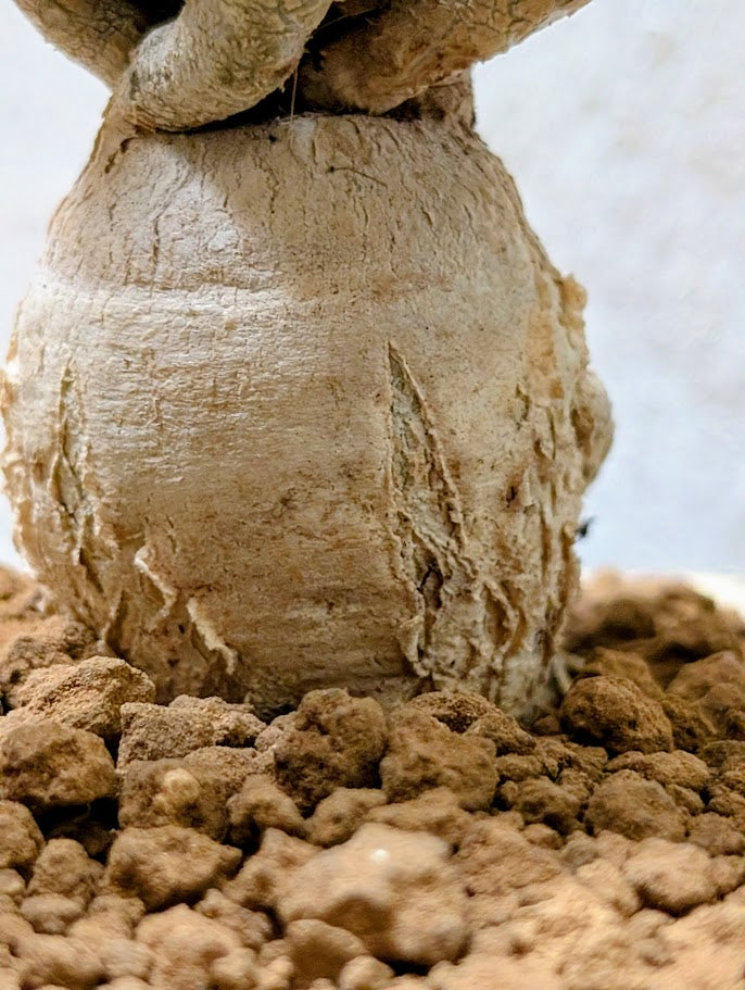 Οι γήινες αποχρώσεις και τα επιφανειακά σημάδια σε στρώσεις τονίζουν την απτική ποιότητα του πηλού, αντανακλώντας το φυσικό περιβάλλον του φυτού.