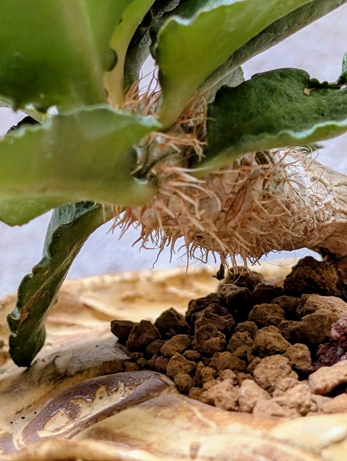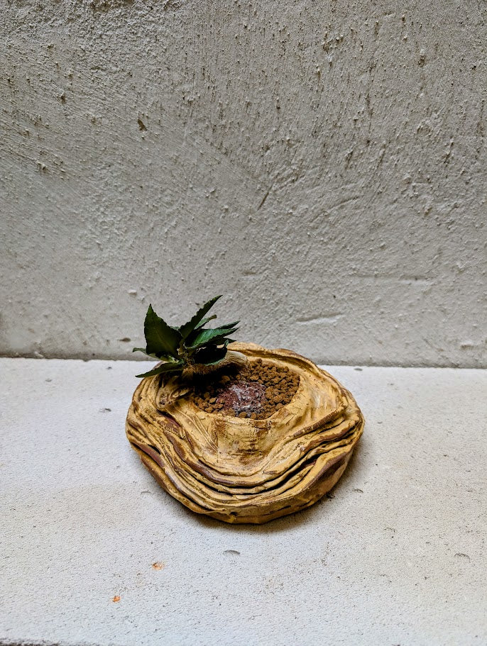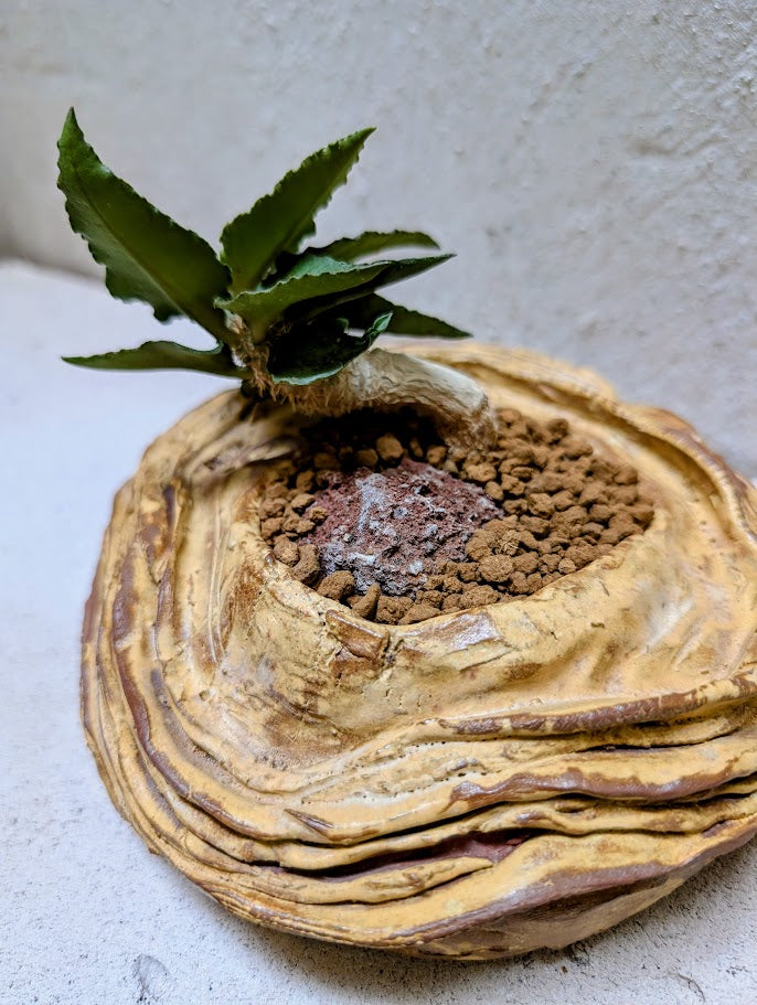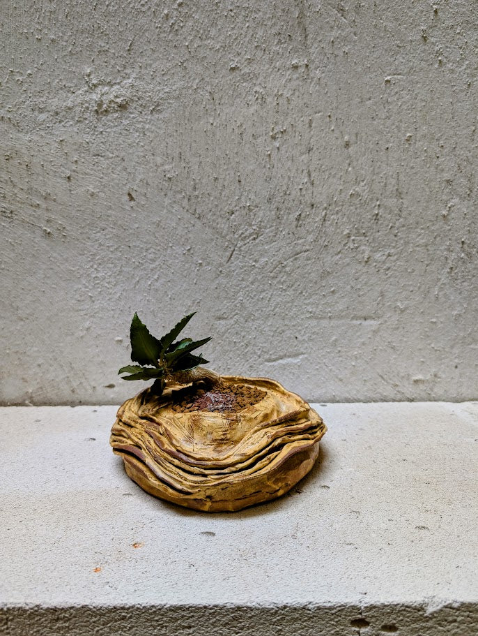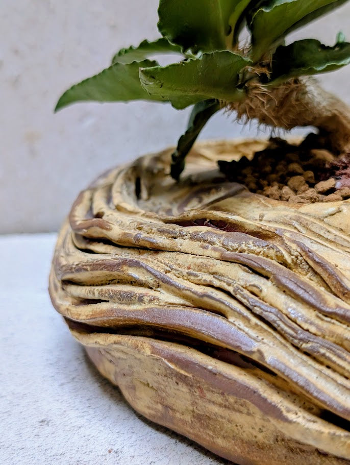 Φυτευμένο σε χειροποίητο κεραμικό δοχείο Neraw με χαμηλή, γεωλογική σιλουέτα και στρωματοποιημένες πτυχώσεις που μοιάζουν με ιζηματογενή πετρώματα ή σκαλιστή τοπογραφική επιφάνεια. Οι ζεστοί γήινοι τόνοι και οι φυσικές παραλλαγές στον πηλό τονίζουν την αίσθηση των στρωμάτων και του χρόνου, πλαισιώνοντας το φυτό σαν ένα μικροσκοπικό τοπίο. Η πλατιά, γειωμένη μορφή του δημιουργεί μια ήρεμη βάση για την κωδικοειδή δομή, επιτρέποντας στο φυτό να διαβαστεί ως ένα γλυπτό στοιχείο που αναδύεται από το έδαφος. Μαζί, φυτό και κεραμικό σχηματίζουν μια σύνθεση που μοιάζει με ένα ευρεθέν κομμάτι γης, συμπαγής, απτή και ήσυχα δραματική.