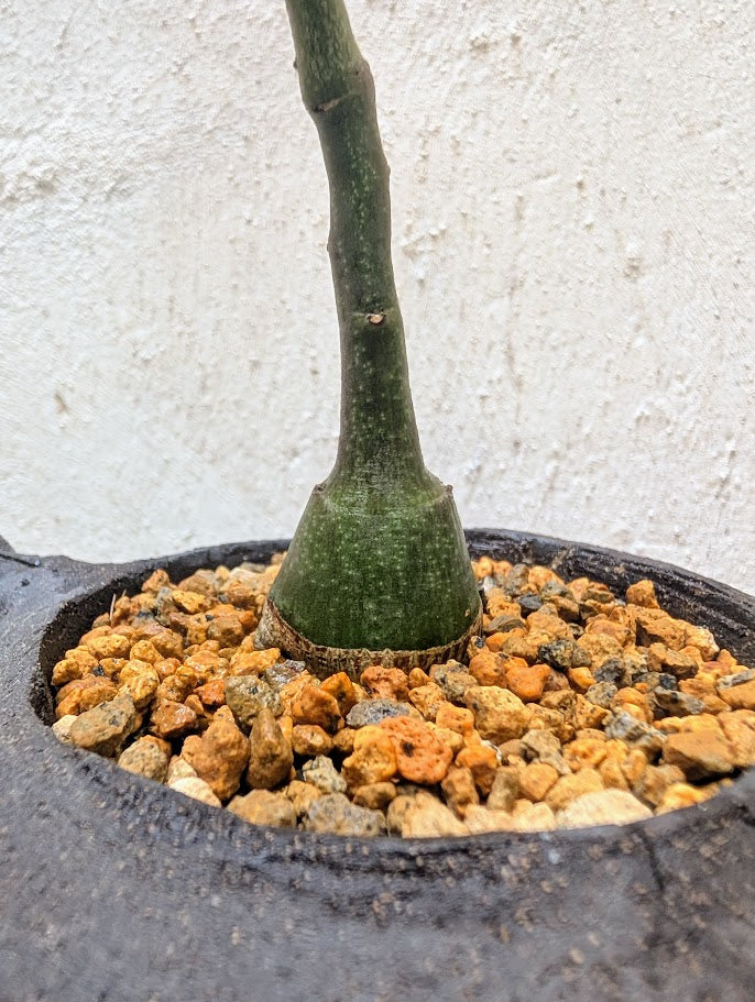 Adenia glauca is a striking caudiciform vine native to southern Africa, admired for its smooth, greenish-gray, bottle-shaped caudex and delicate climbing stems. The thickened trunk serves as a water reservoir, allowing it to survive in arid environments. Its leaves are bright green and heart-shaped, often with a subtle bluish tint, while small yellow-green flowers appear along the slender vines in the warmer months. Mature specimens can live for decades, developing a beautifully aged patina on the caudex surface.
