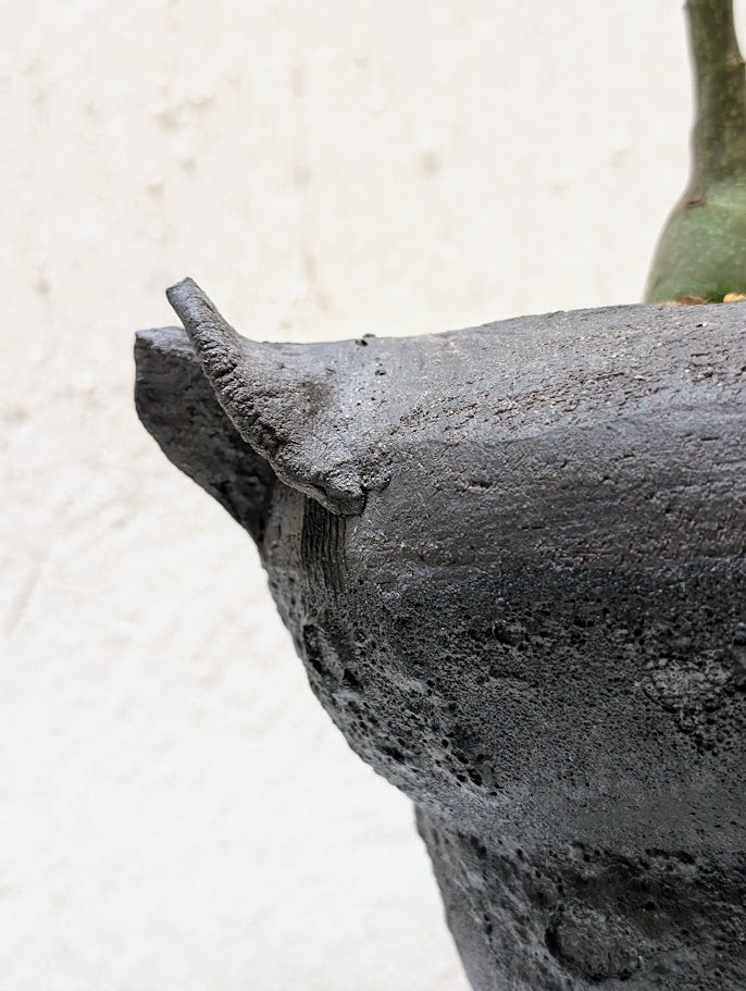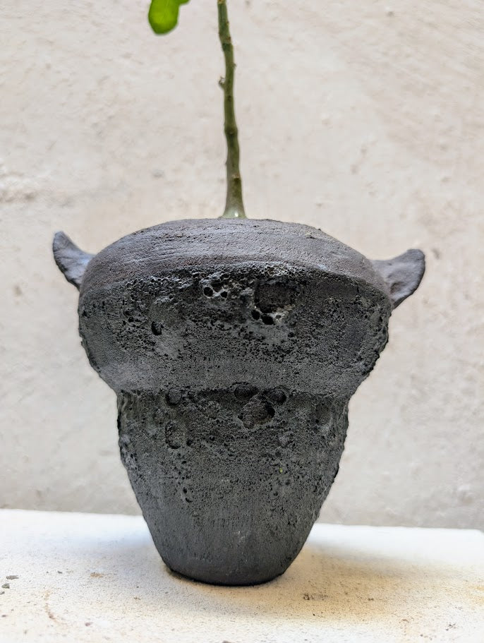 Planted in a handcrafted Neraw vessel inspired by volcanic textures, with a dark, matte surface and raw, eroded contours. The form echoes ancient, weather–worn artifacts, while the asymmetrical handles give it a primitive, ceremonial presence that frames the plant as a living relic.
