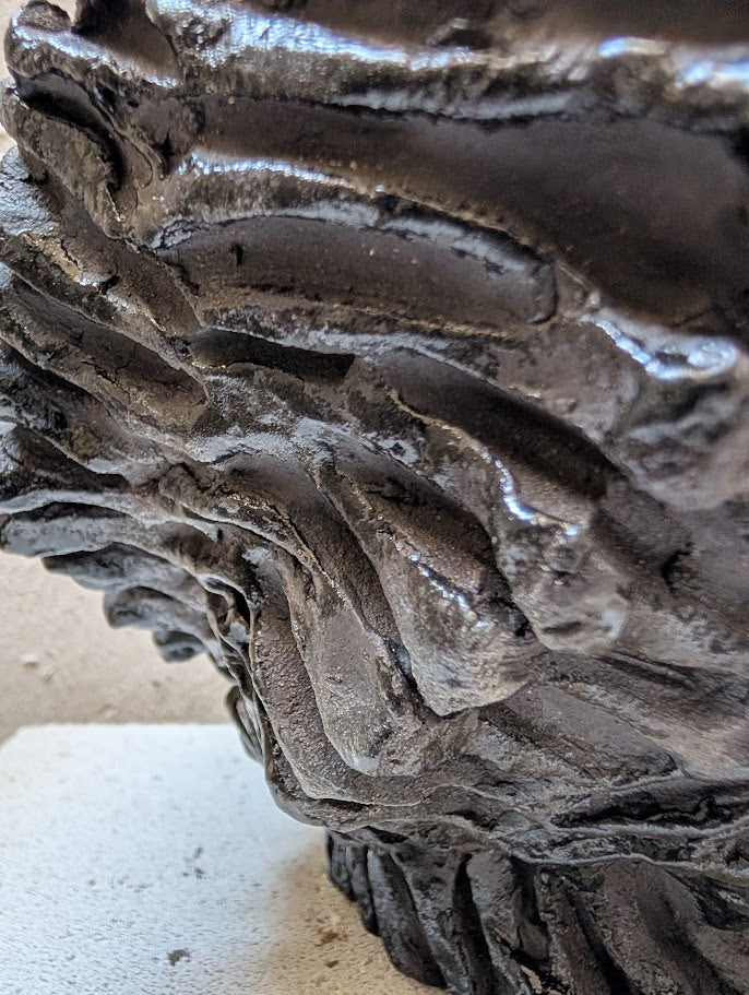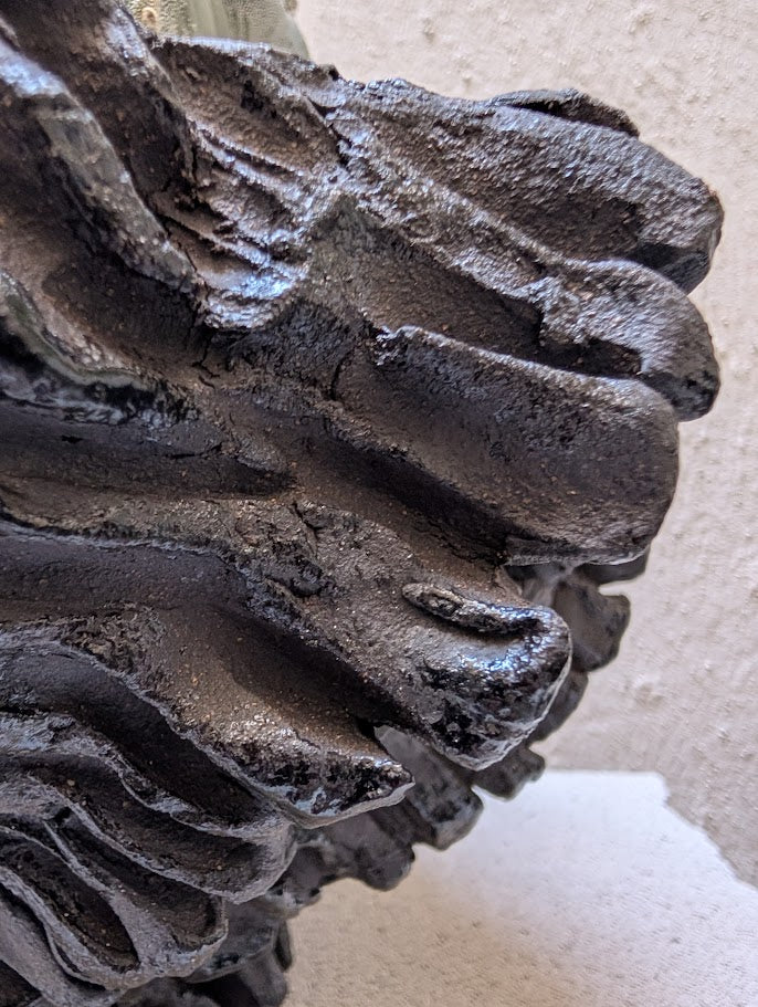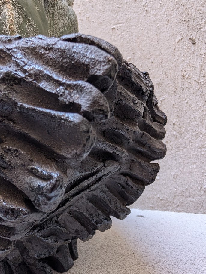 Its matte black glaze carries subtle metallic reflections, highlighting the layered movement of the clay. Each fold preserves the gesture of the hand that shaped it, creating a powerful contrast between the cactus’s soft geometry and the vessel’s raw, geological form.