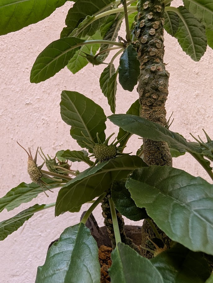 Dorstenia foetida produces unusual and inconspicuous flowers. The flowers are often small and lack petals, but they are surrounded by specialized bracts that may be more noticeable than the actual flowers. The plant's reproductive structures are adapted for attracting and trapping small insects.