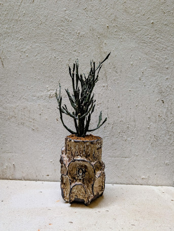 Together, plant and ceramic form a totem-like composition, where organic geometry and material memory coexist in a quiet but powerful balance.