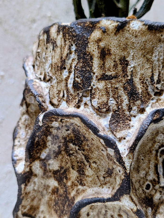 The vessel’s surface is rich with layered textures, circular impressions, and mineral glazes that recall weathered stone, fossilized wood, or ancient architectural fragments.
