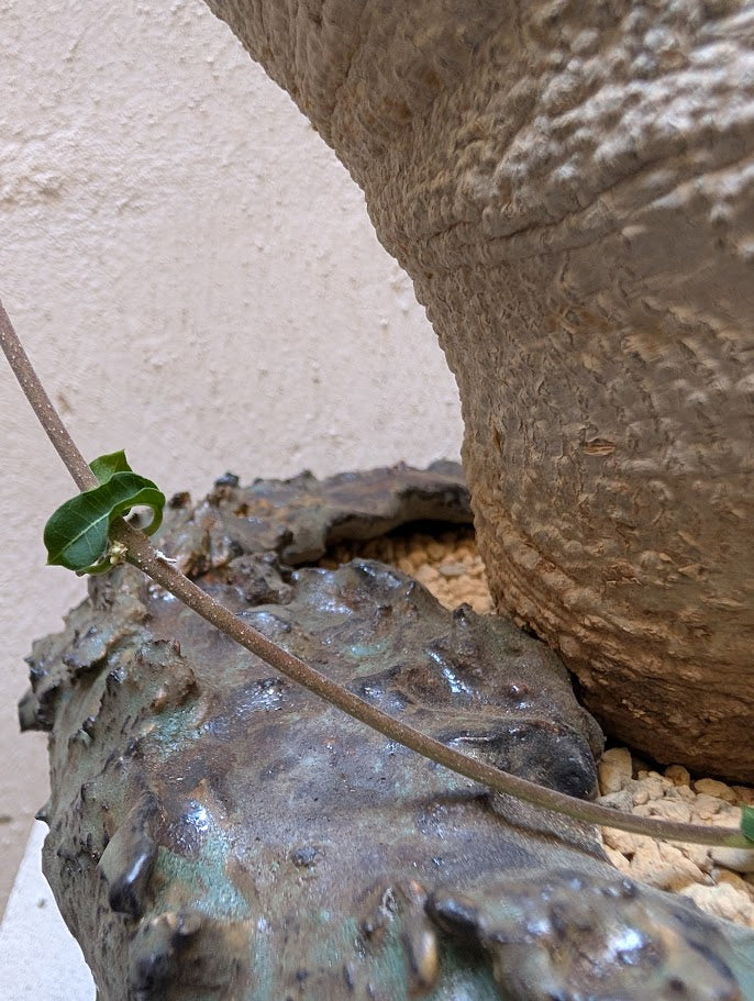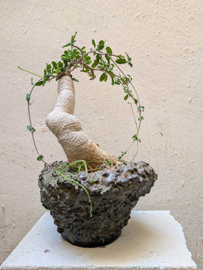 The glaze moves between deep bronze and oxidised green, capturing the raw energy of earth and fire. Each ridge and indentation forms naturally during the firing, giving the piece a tactile, geological presence that grounds the plant’s soft, climbing growth.