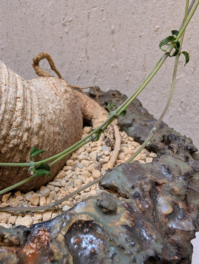 - Fockea edulis is a slow-growing caudiciform succulent native to South Africa, prized for its bulbous, sculptural base and slender climbing vines. This plant is approximately 10–12 years old, displaying a beautifully aged caudex with textured, cork-like skin that stores water for long dry periods. Its vines bear small, glossy green leaves and may produce clusters of pale green to white flowers in summer. Over time, it develops into a living sculpture that embodies both resilience and grace.