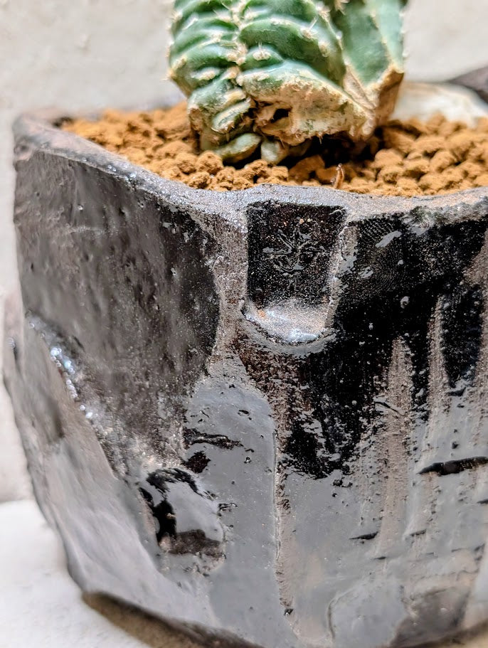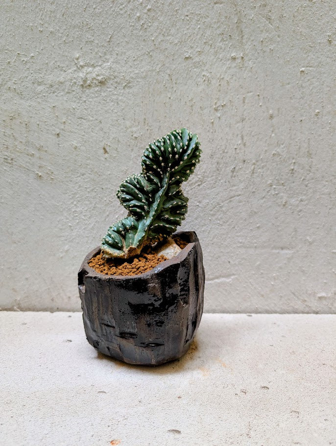 Planted in a handcrafted Neraw ceramic vessel with a dark, volcanic tone and a faceted, chiseled surface that feels carved rather than shaped. The compact, angular form frames the crest like a small monolith, grounding its movement while amplifying its graphic silhouette. Subtle variations in sheen and texture catch the light across the cuts, creating depth and a quiet sense of force. Together, plant and ceramic form a striking miniature landscape, where mineral presence meets living geometry.