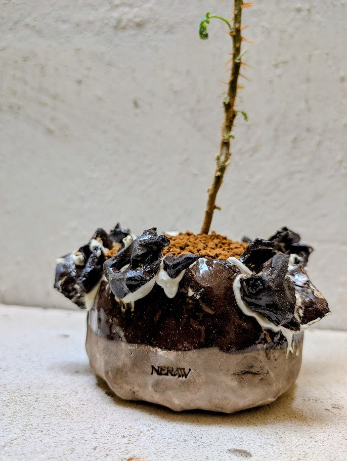 Planted in a handcrafted Neraw ceramic vessel with a low, grounded form and an aggressively textured rim.