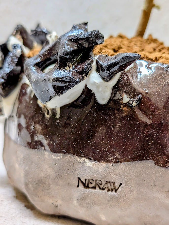 The surface combines deep, dark tones with raw clay and flowing, milky glaze drips that appear to spill and fracture across the edge, evoking molten material and geological rupture.